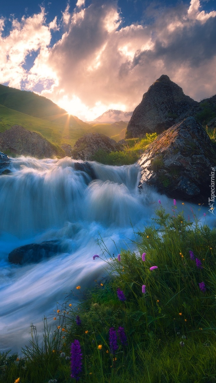 Edytor tapety: Wschód słońca nad górskim potokiem