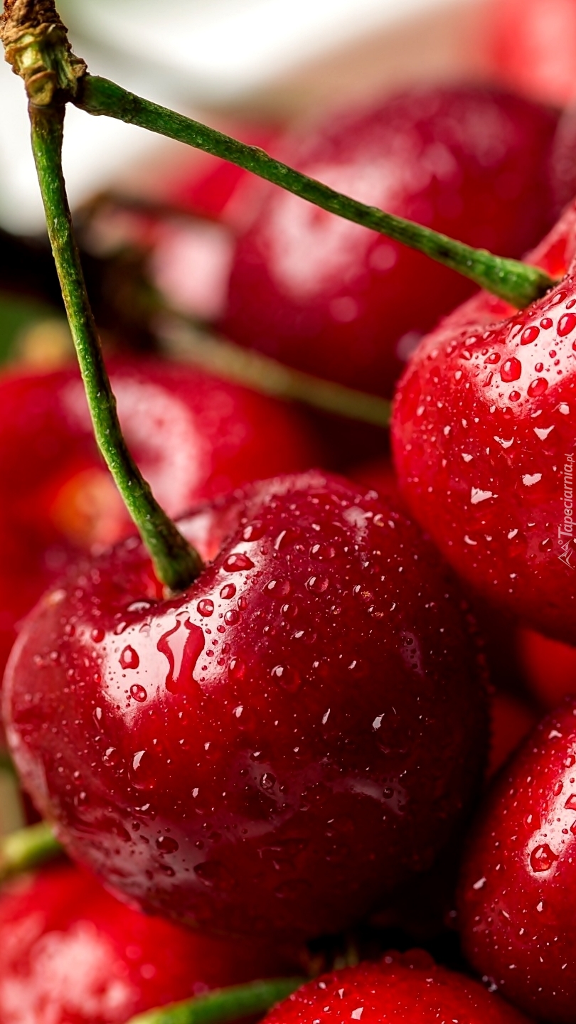 Edytor tapety: Krople wody na wiśniach w zbliżeniu