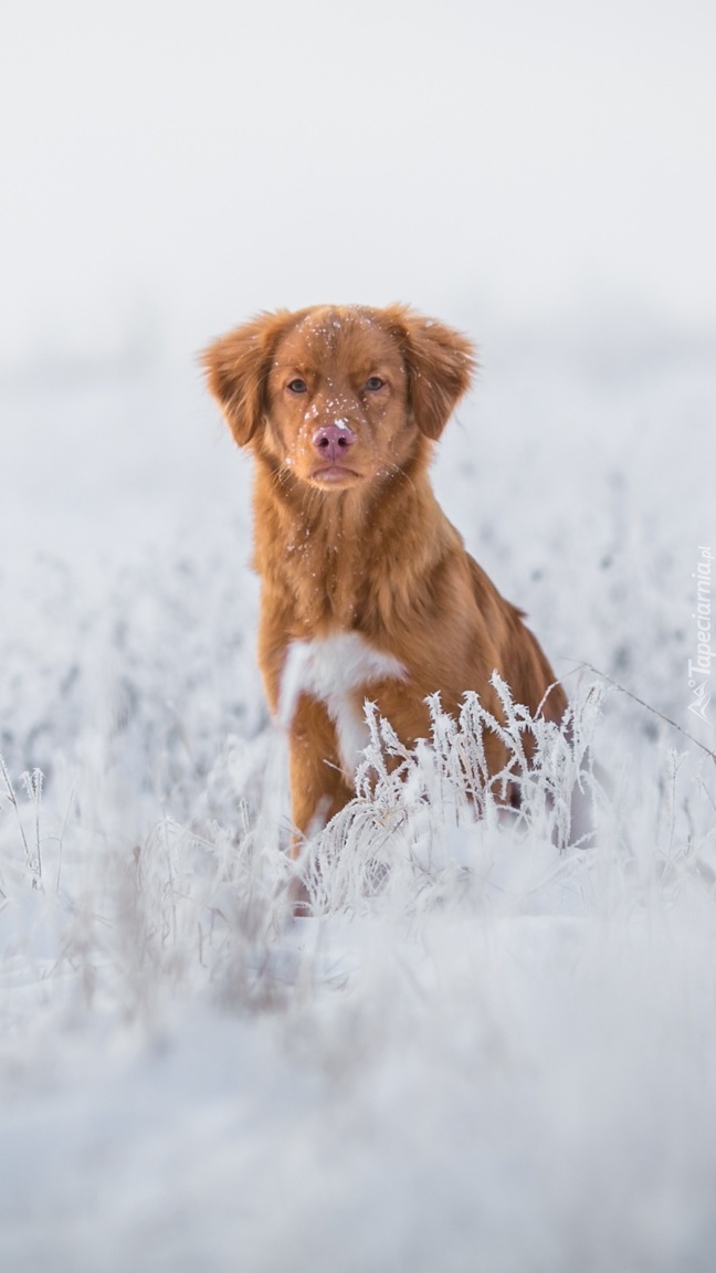 Edytor tapety: Rudy pies w oszronionych gałązkach