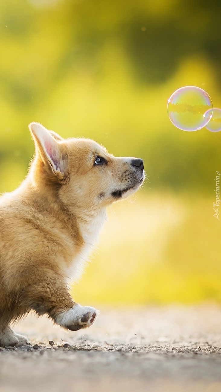 Edytor tapety: Piesek biegnący za bańką mydlaną