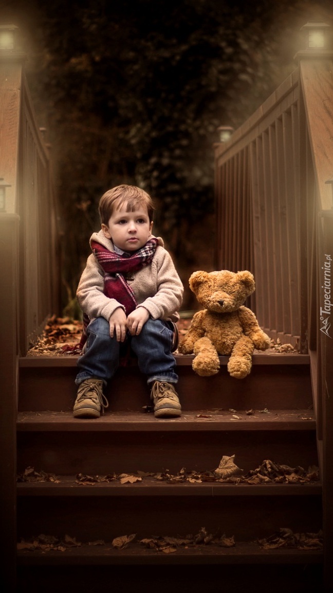 Edytor tapety: Chłopiec z misiem na schodach