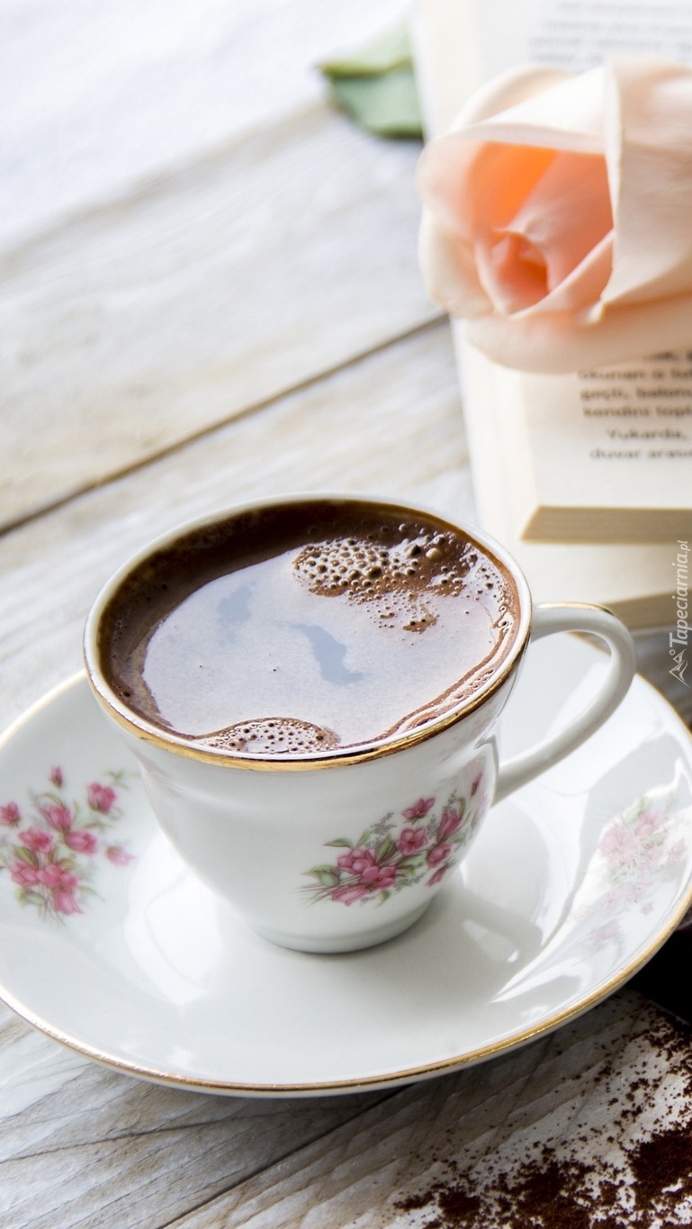 Edytor tapety: Filiżanka kawy przy książce z różą