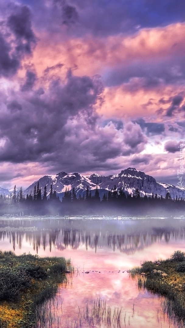 Edytor tapety: Kłębiaste chmury i mgła nad jeziorem