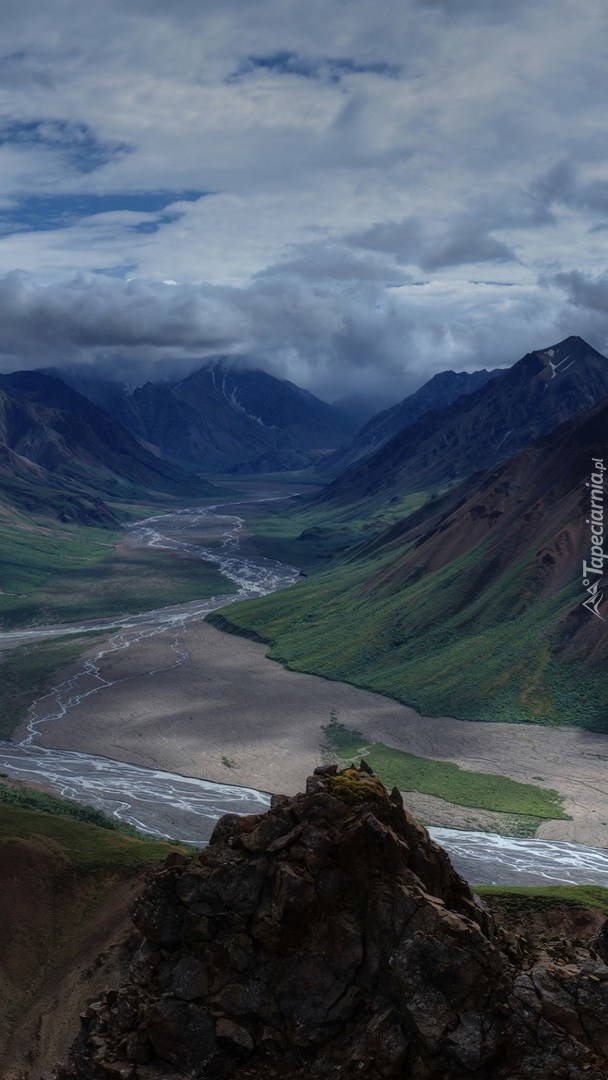 Edytor tapety: Rzeka pomiędzy szczytami gór