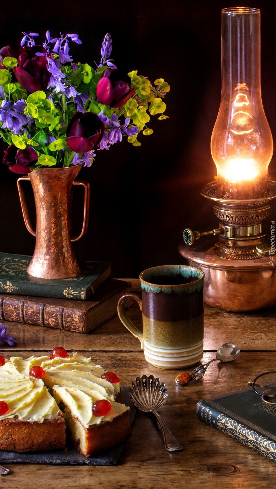 Edytor tapety: Ciasto z kawą przy lampie naftowej