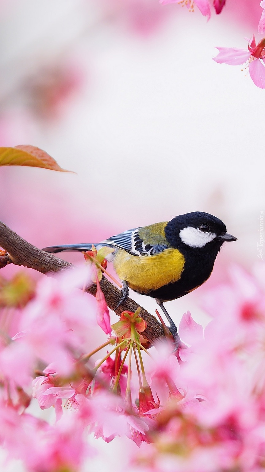 Edytor tapety: Bogatka zwyczajna na kwitnącej gałązce