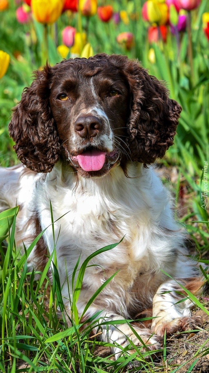 Edytor tapety: Springer spaniel angielski na tle tulipanów