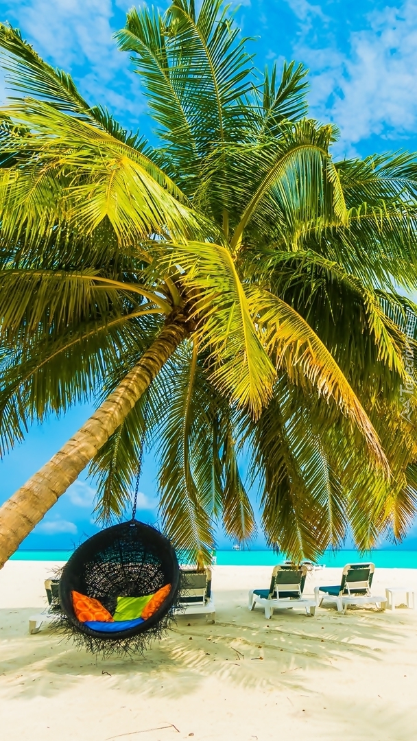 Edytor tapety: Leżaki i hamak pod pochyloną palmą