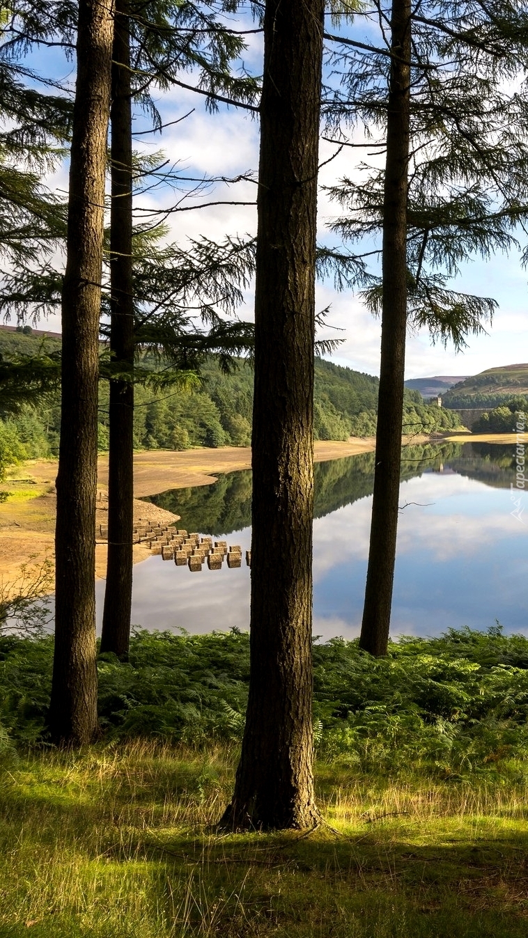 Edytor tapety: Wysmukłe drzewa nad rzeką Derwent