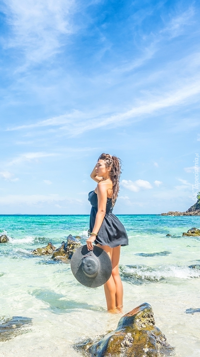Edytor tapety: Kobieta z kapeluszem na brzegu morza