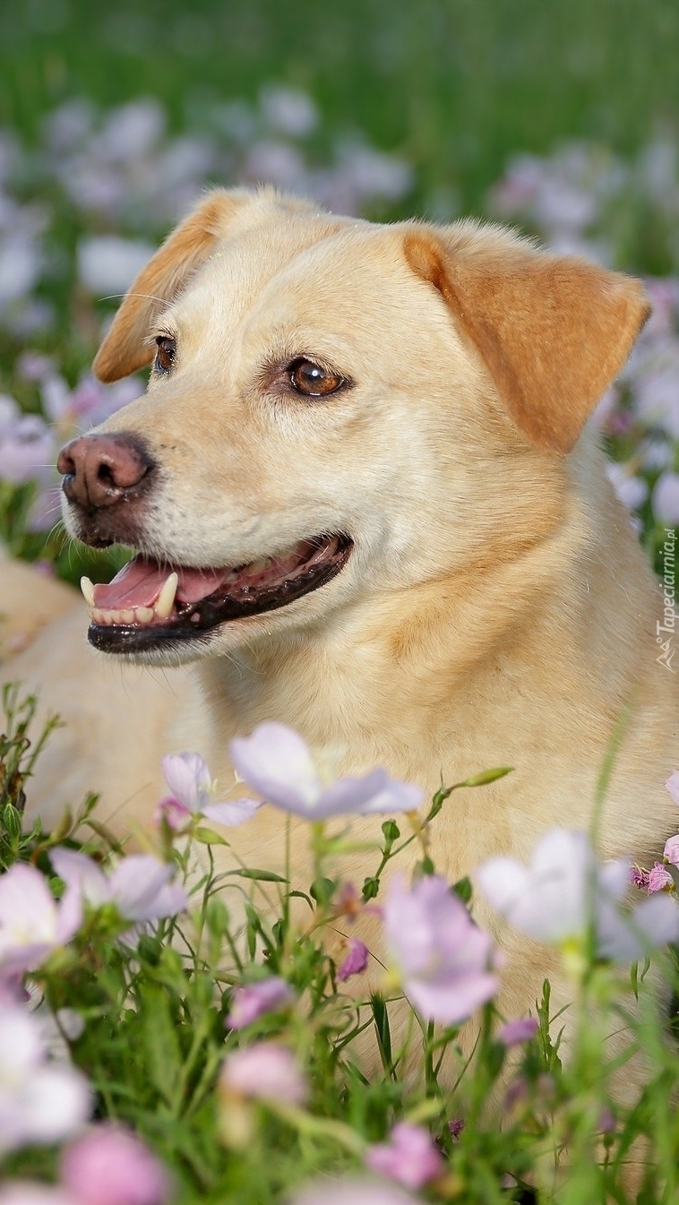 Edytor tapety: Zadowolony pies w kwiatach