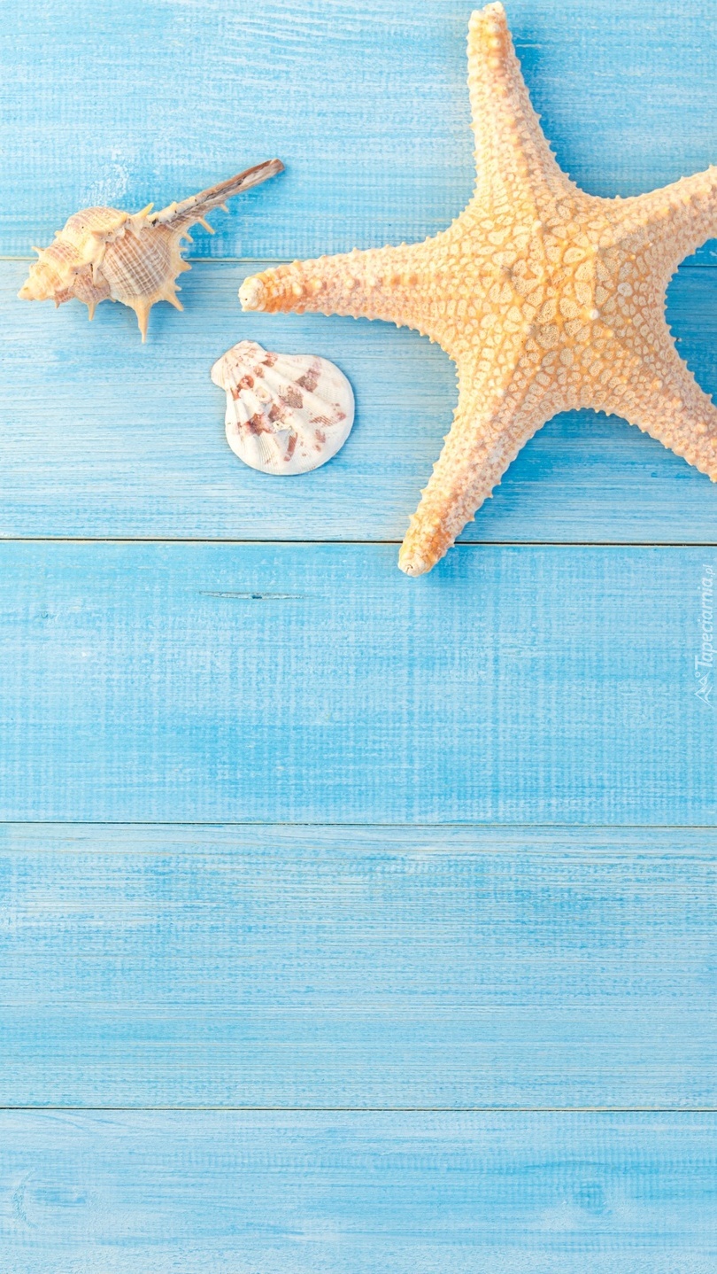 Edytor tapety: Rozgwiazga i muszelki na niebieskich deskach