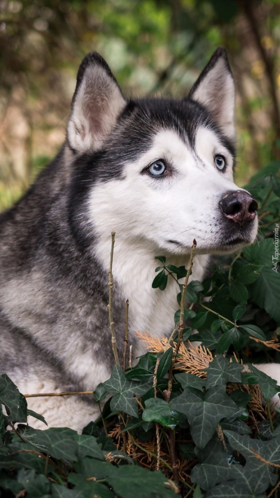 Edytor tapety: Siberian husky w gałązkach bluszczu