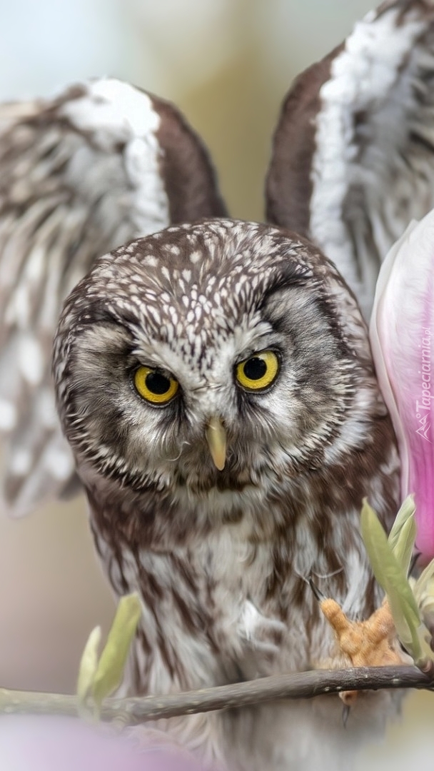 Edytor tapety: Włochatka na gałązce magnolii
