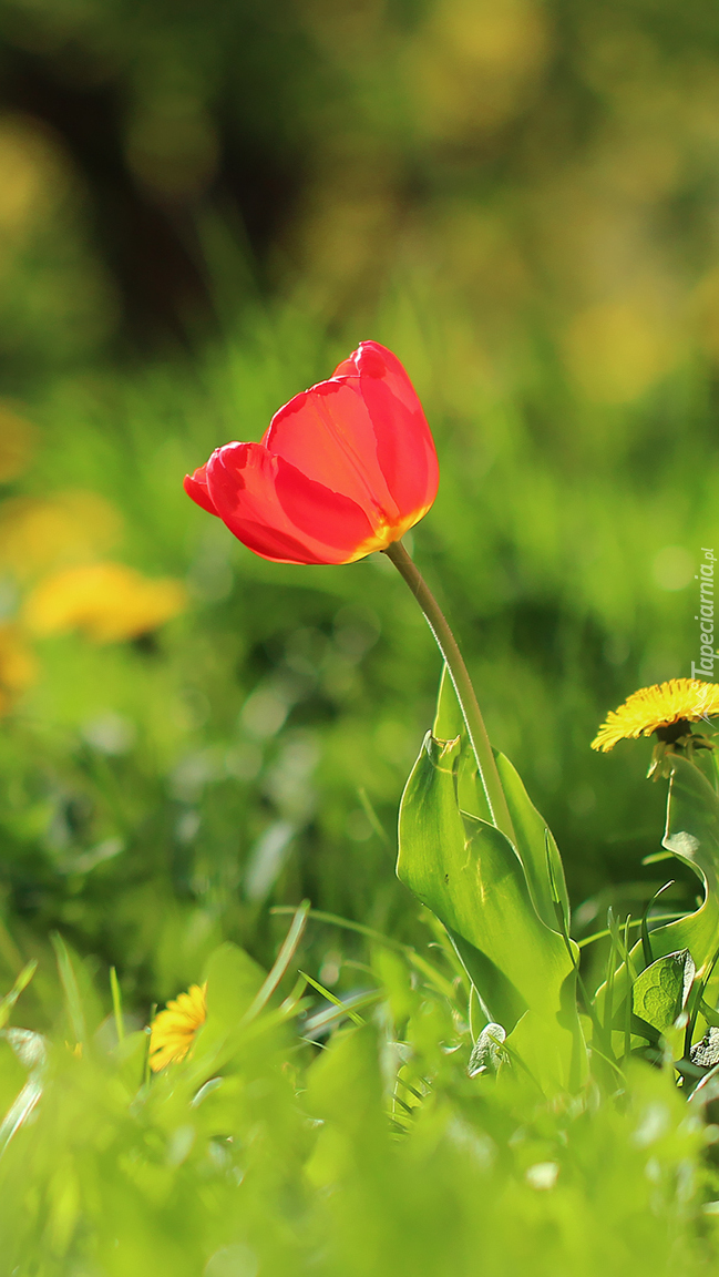 Edytor tapety: Czerwony tulipan z mniszkiem w trawie