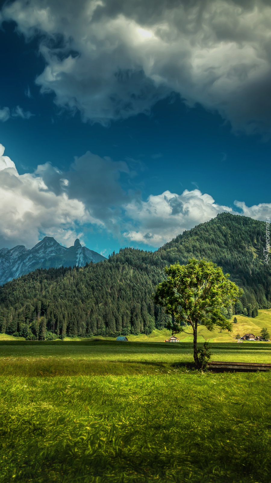 Edytor tapety: Domki w oddali na tle gór