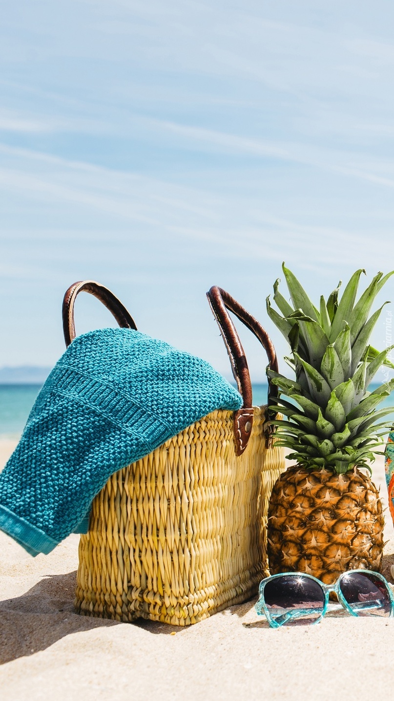 Edytor tapety: Ananas obok koszyka z ręcznikiem