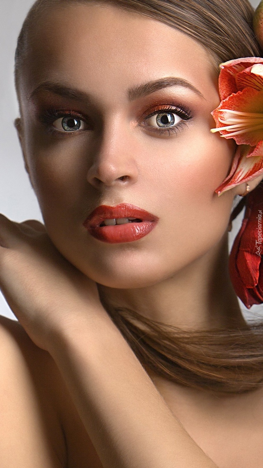 Edytor tapety: Spojrzenie kobiety z kwiatem we włosach
