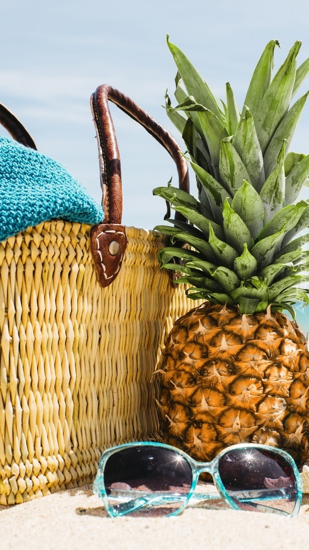 Edytor tapety: Ananas obok koszyka i okularów