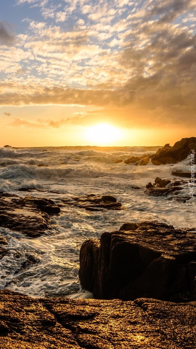 Edytor tapety: Skały w morzu o wschodzie słońca
