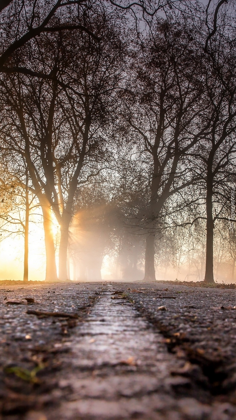 Edytor tapety: Droga we mgle o wschodzie słońca