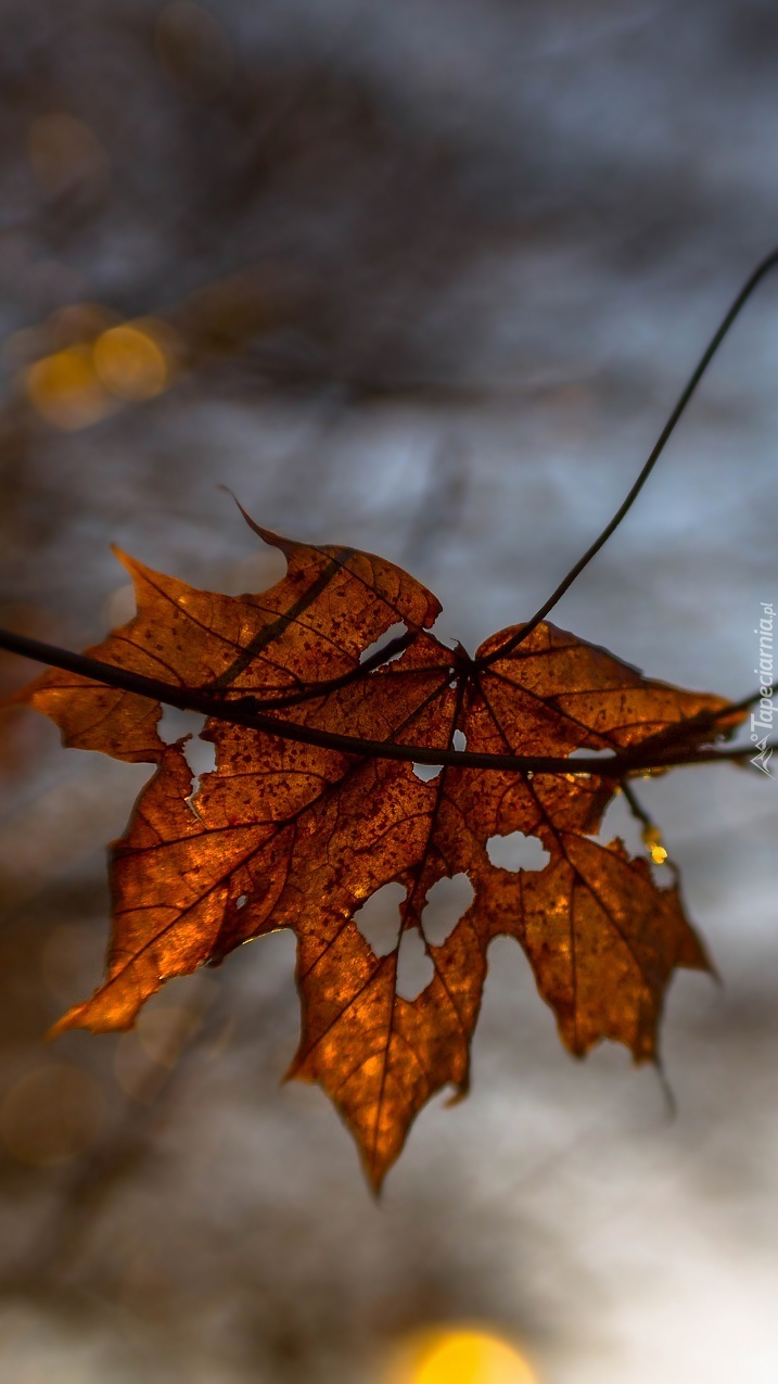 Edytor tapety: Dziurawy liść na rozmytym tle