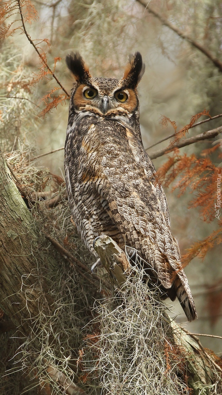 Edytor tapety: Puchacz wirginijski na drzewie