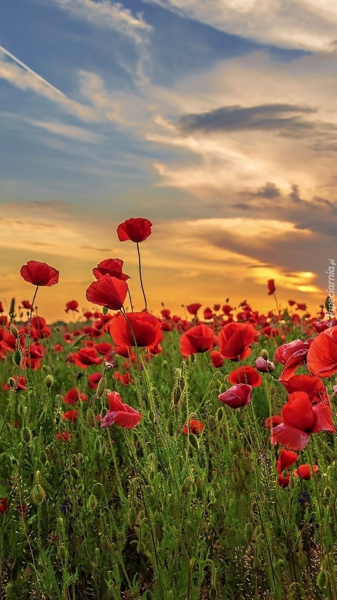 Edytor tapety: Zachód słońca nad polem maków