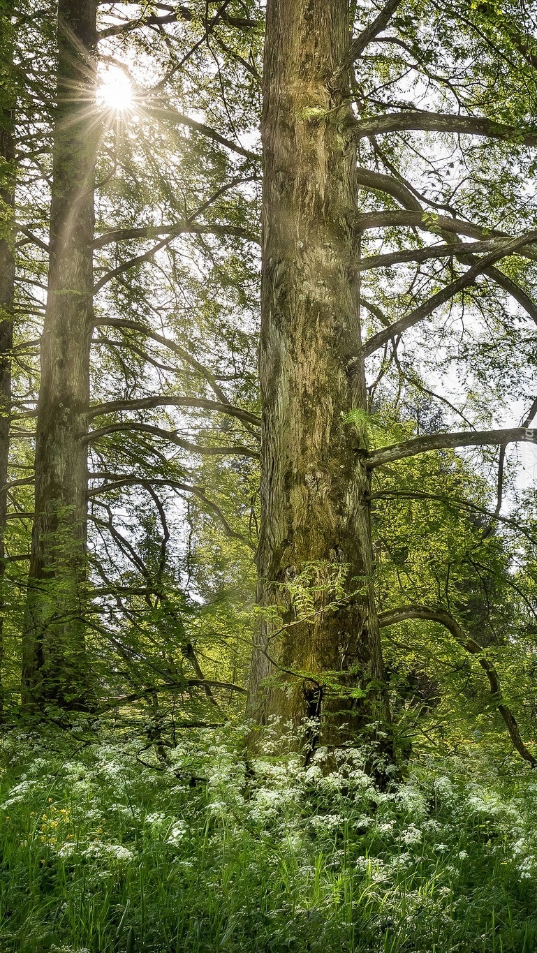Edytor tapety: Promienie słońca w wiosennym lesie