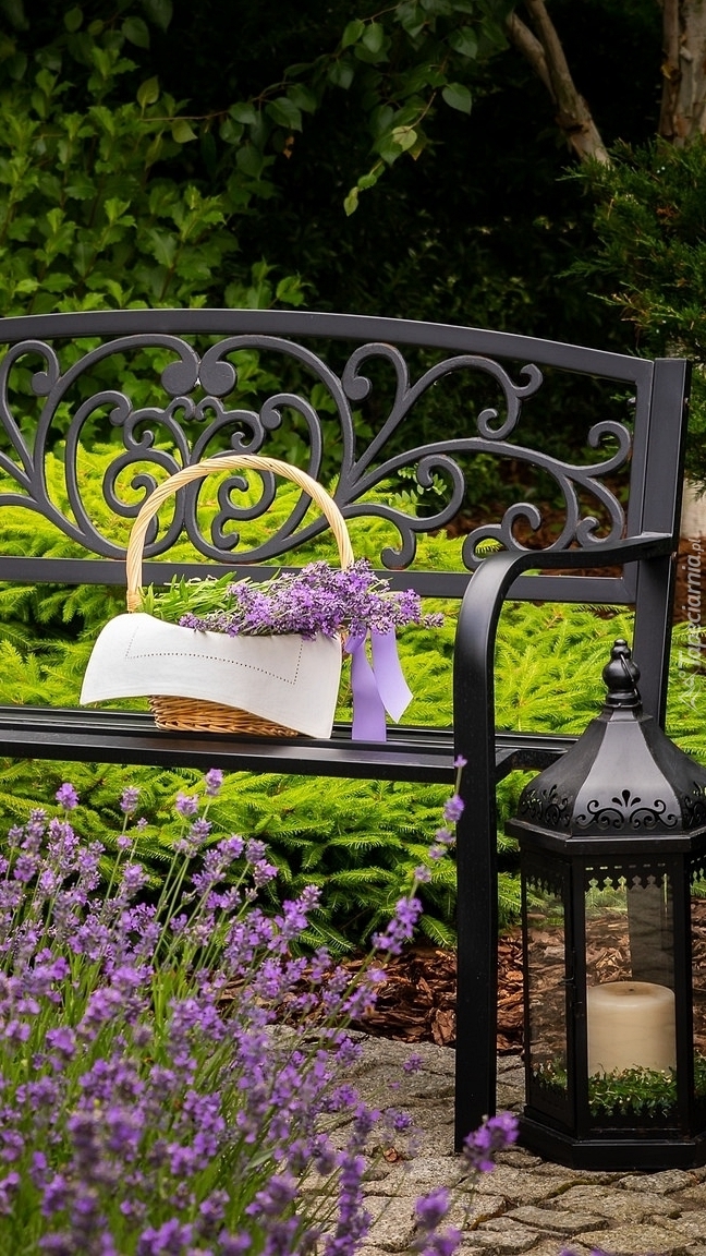 Edytor tapety: Koszyk z lawendą na metalowej ławce