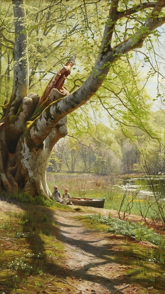 Edytor tapety: Dzieci i łódka na brzegu rzeki
