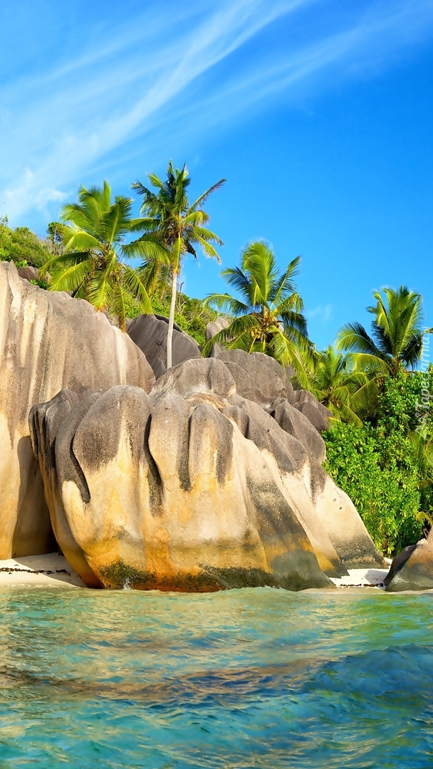 Edytor tapety: Palmy i głazy na brzegu morza
