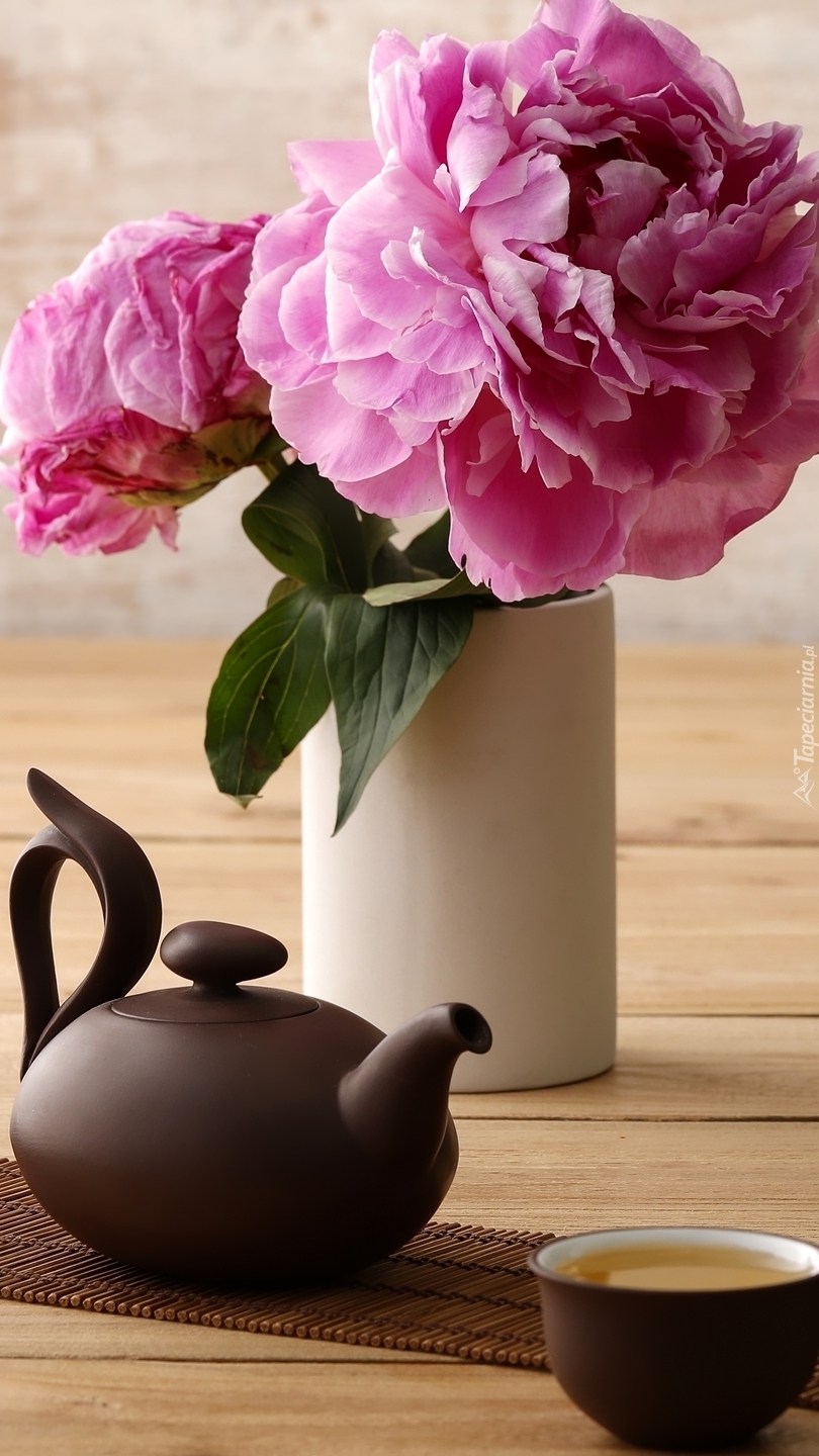 Edytor tapety: Piwonie obok czajniczka