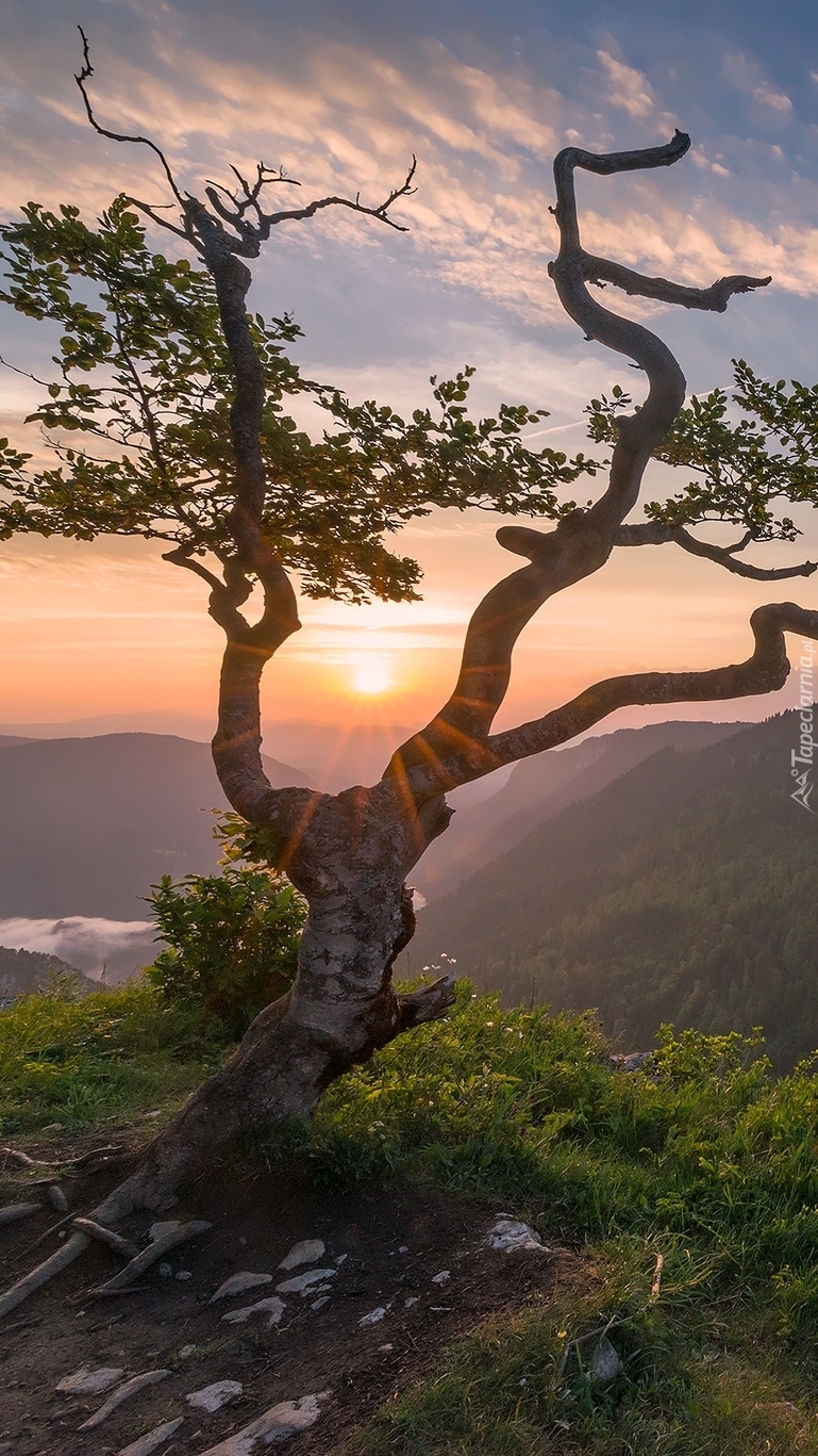 Edytor tapety: Drzewo na skale o wschodzie słońca