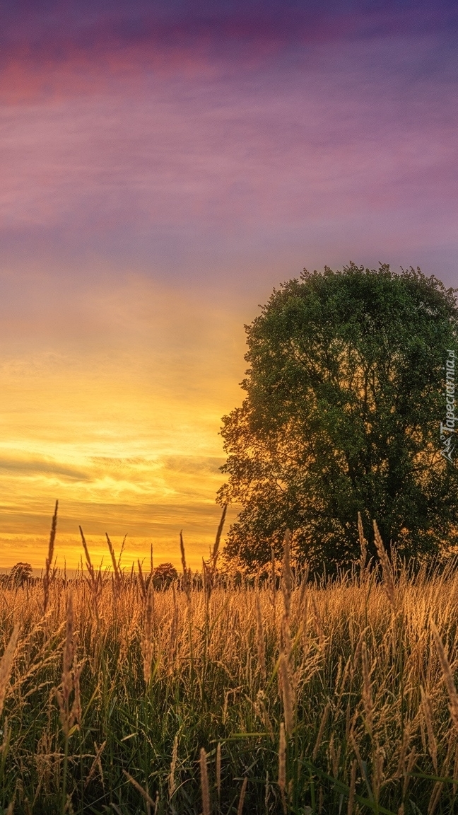 Edytor tapety: Drzewo w trawie o zachodzie słońca