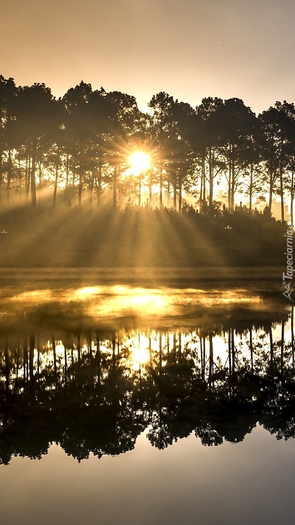 Edytor tapety: Drzewa nad jeziorem w promieniach słońca