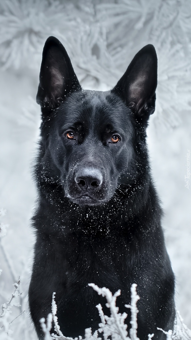 Edytor tapety: Czarny owczarek niemiecki oprószony śniegiem