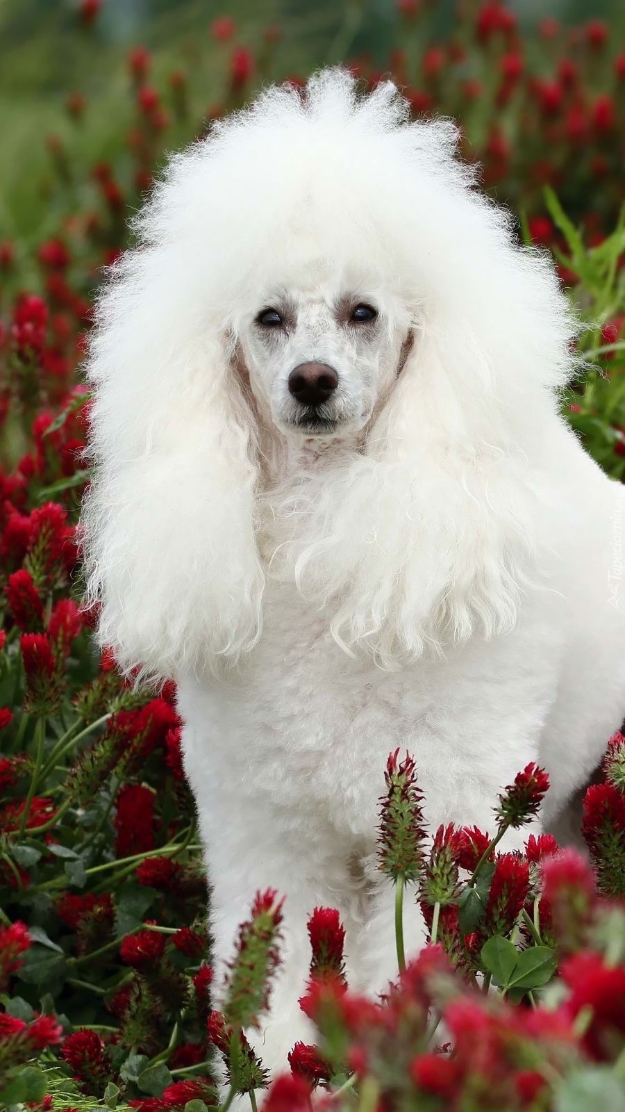 Edytor tapety: Biały pudel w czerwonej koniczynie