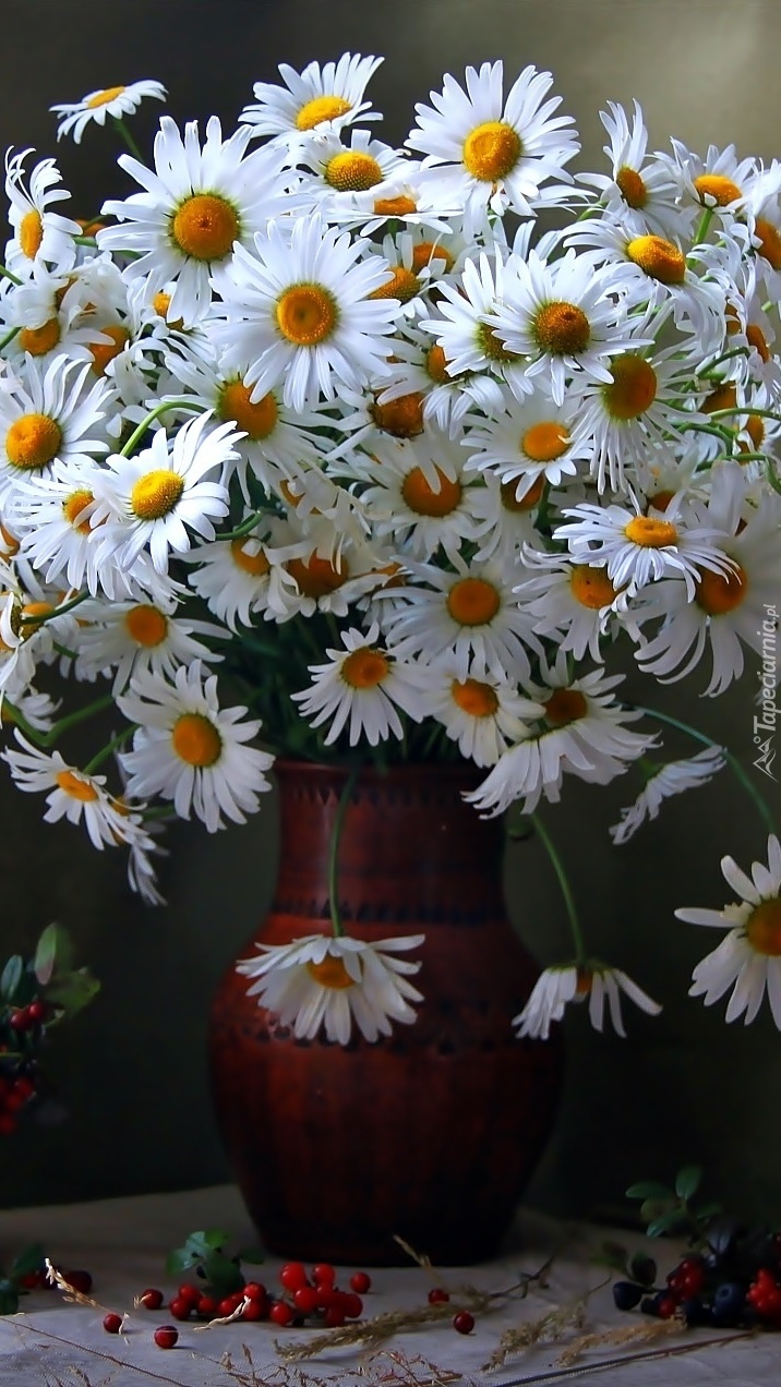 Edytor tapety: Bukiet margerytek w czerwonym wazonie