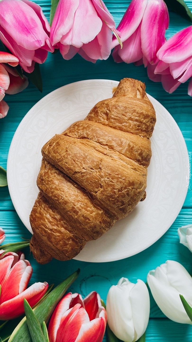 Edytor tapety: Tulipany wokół rogalika na talerzyku