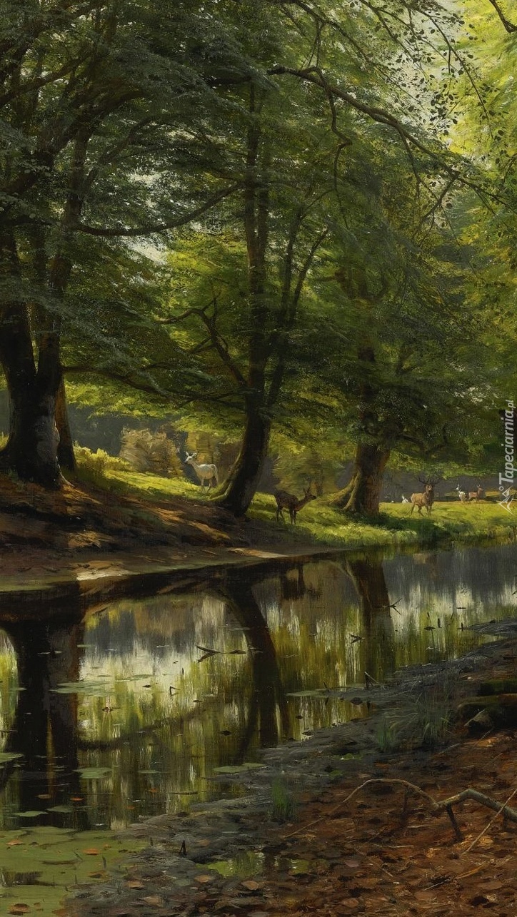 Edytor tapety: Drzewa i jelenie nad rzeką
