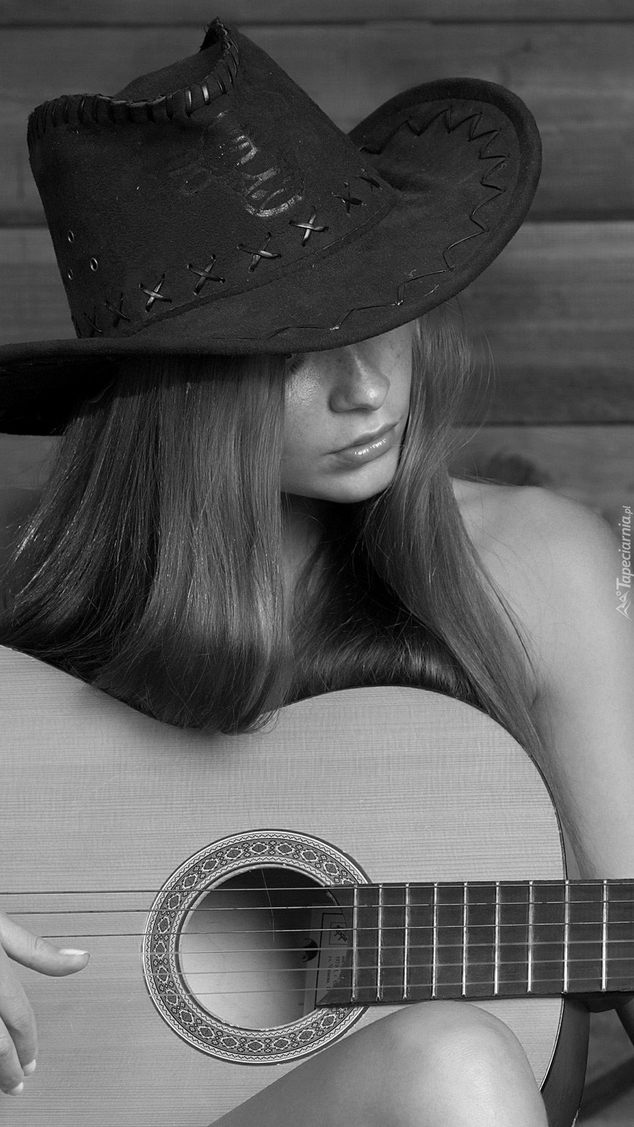 Edytor tapety: Dziewczyna w kapeluszu grająca na gitarze
