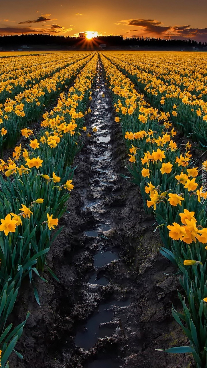 Edytor tapety: Zachód słońca nad plantacją żonkili