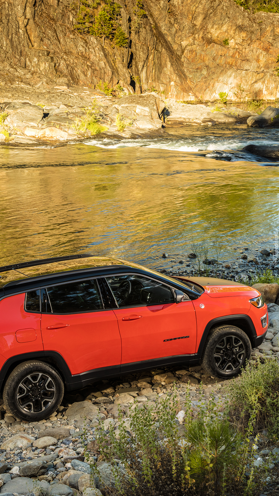 Edytor tapety: Czerwony Jeep Compass na brzegu rzeki