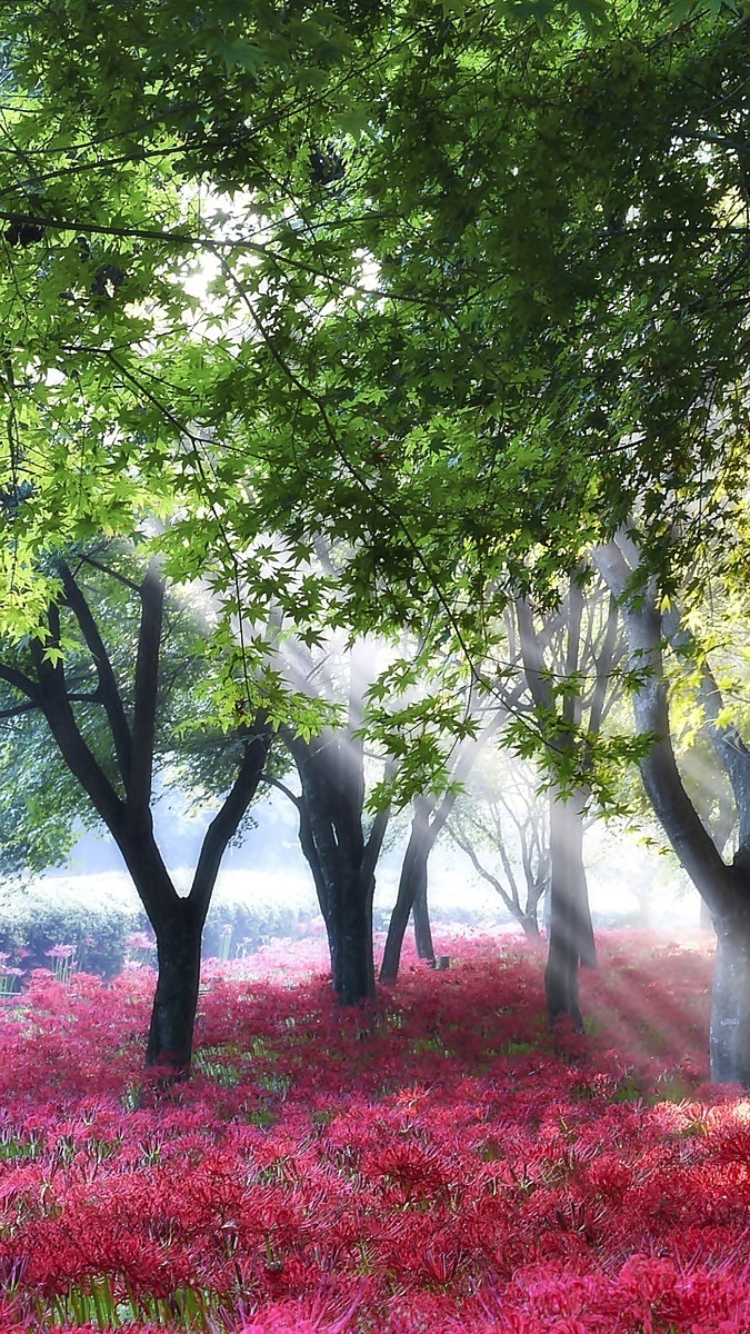 Edytor tapety: Słoneczne promienie ogrzewają kwiaty w parku