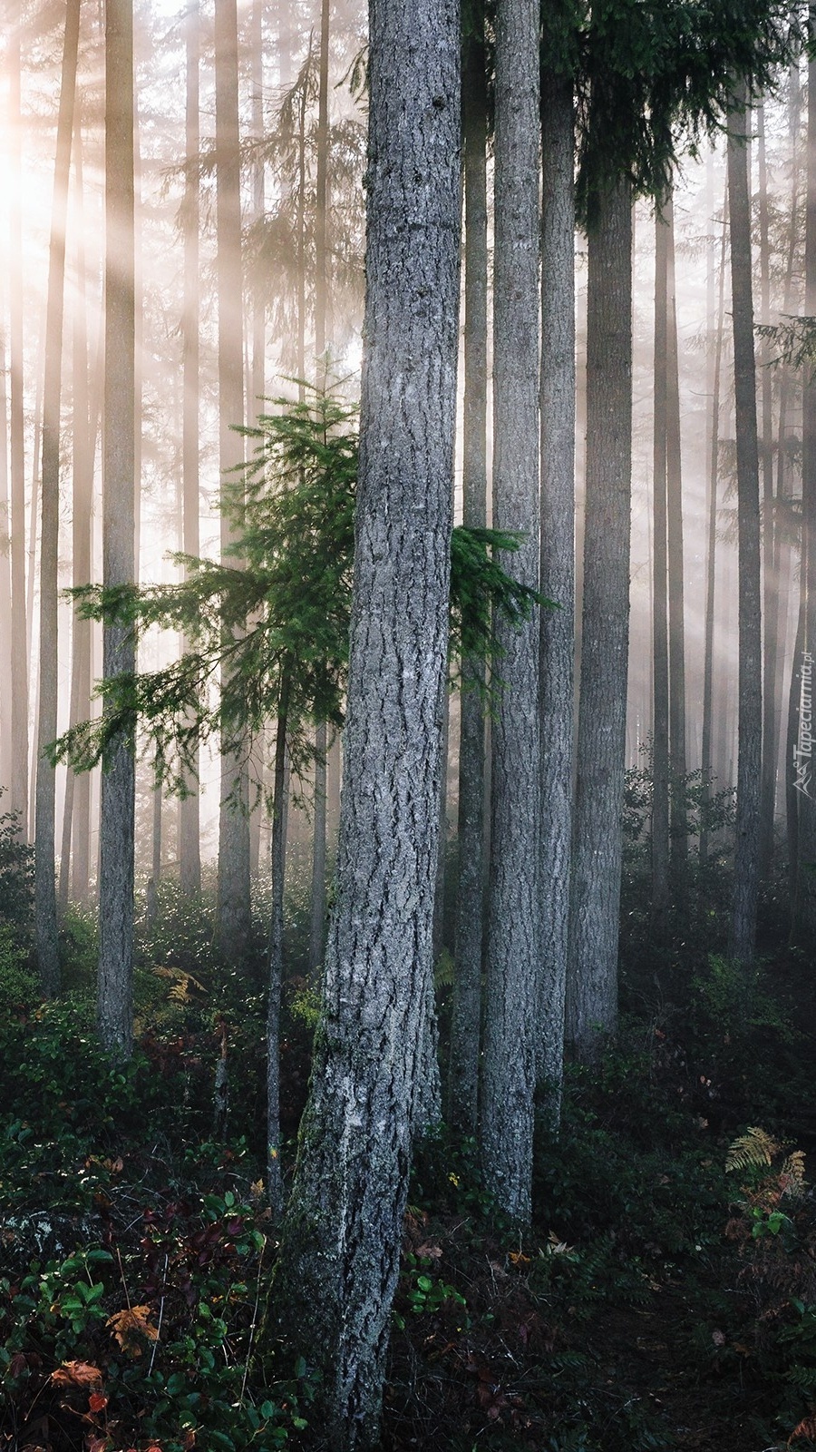 Edytor tapety: Promienie słońca w zamglonym lesie