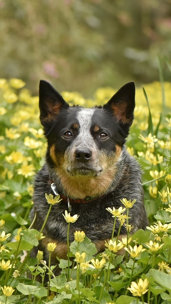 Edytor tapety: Australian cattle dog w żółtych kwiatach