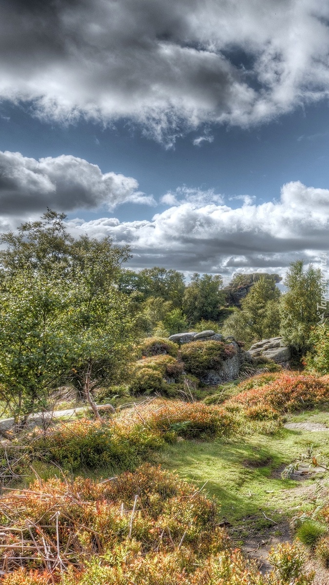 Edytor tapety: Ciemne chmury nad drzewami i skałami