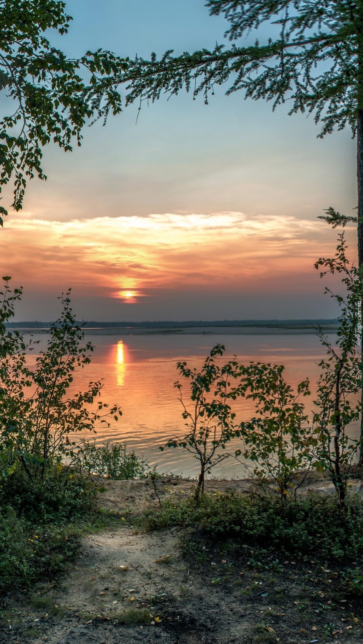 Edytor tapety: Drzewa i zachód słońca nad jeziorem