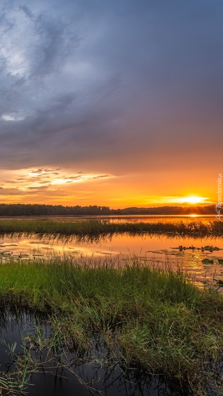 Edytor tapety: Zachód słońca nad porośniętym jeziorem